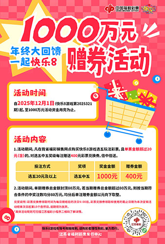 岁末送暖,快乐不断。江苏福彩倾情推出“年终大回馈,一起快乐8”千万赠券活动,为您送上甜蜜惊喜与满满好运。1000万元彩票兑换券暖心放送,为平凡日子添一份惊喜,加一份好运!