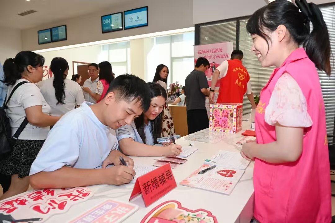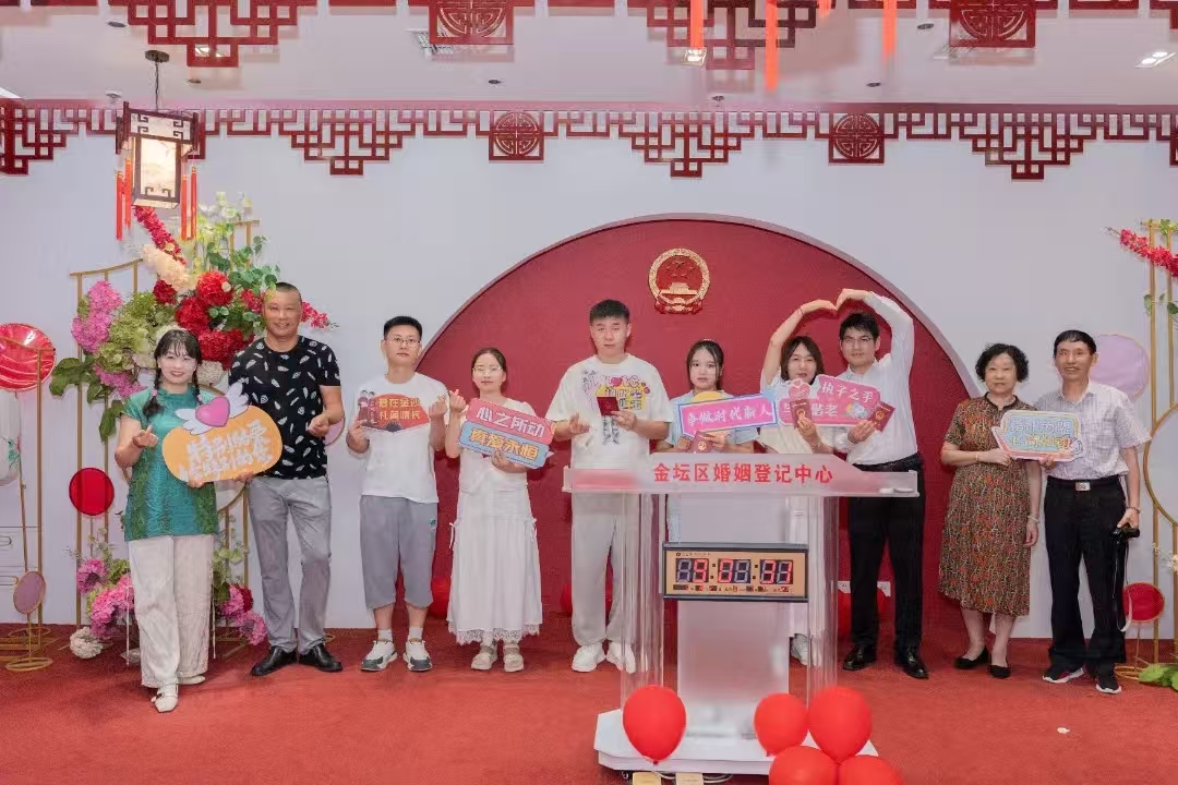 金坛区举办了“爱在金沙礼简情长”七夕特邀颁证仪式暨文明婚俗倡导活动,通过新人宣誓、嘉宾颁证、名人分享、新风课堂等环节,强化婚姻登记仪式感与法律庄严性,倡导“重情轻礼”的新型婚恋价值观,弘扬“婚事新办、仪式从简”文明新风尚。