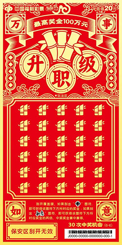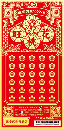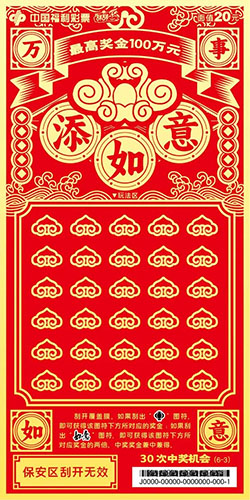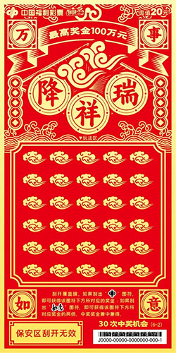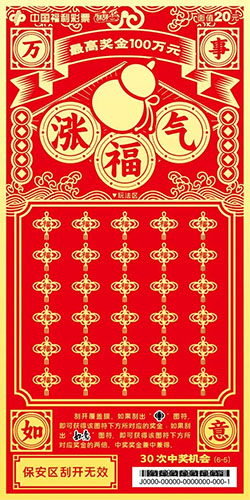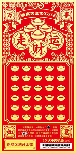 本套彩票共六张,画面简洁大气、喜庆吉祥,分别以“走财运”“降祥瑞”“添如意”“旺桃花”“涨福气”“升职级”为主题,并加以传统吉祥纹饰相呼应。该套彩票采用中国红为背景,以金黄色的笔触为刻刀,运用中国传统剪纸风格刻画出人们对美好生活的向往。