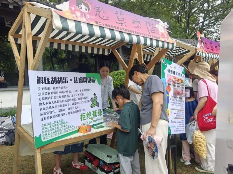“焦虑刮刮乐·焦虑再见站”前总是排着长队。参与者从中抽取一张焦虑刮刮卡,刮开涂层即可获得小礼品与一段专属的正念语。“开花不内卷,生活不焦虑”、“页页有光,不急不忙”……这些句子旨在帮助大家在感到焦虑时,通过朗读来重获内心的平静。每一次刮卡,不仅是为了收获惊喜礼物,更是一次主动“刮走”焦虑、学习解压方法的愉快体验。