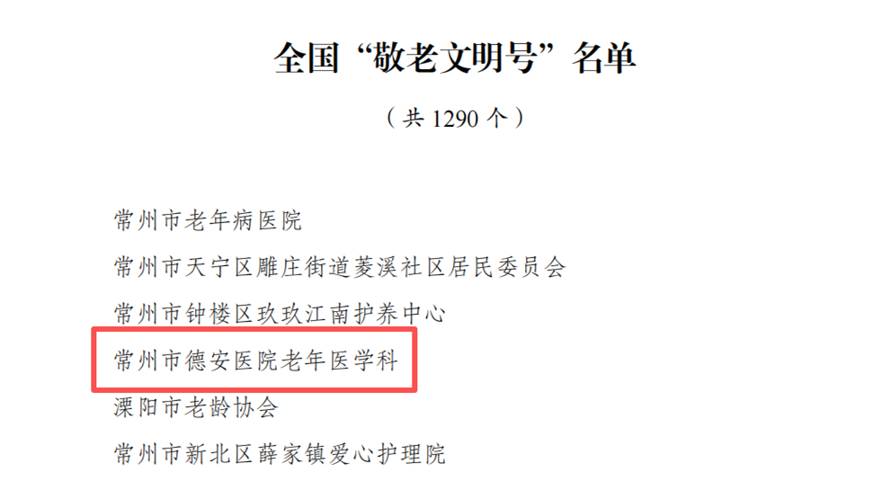 近日,全国老龄工作委员会办公室发布《关于表彰全国“敬老文明号”和全国“敬老爱老助老模范人物”的决定》,常州市德安医院老年医学科凭借深厚的医养结合服务积淀、专业的照护能力与深厚的人文关怀,成功获评全国“敬老文明号”,成为常州市医养结合服务领域的典范。